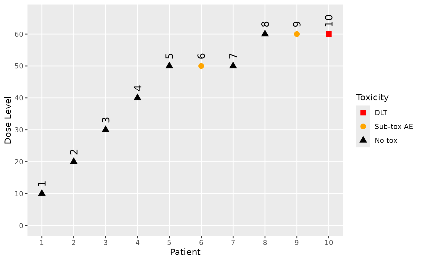 yCategories = c("No tox" = 0L, "Sub-tox AE" = 1L, "DLT" = 2L),