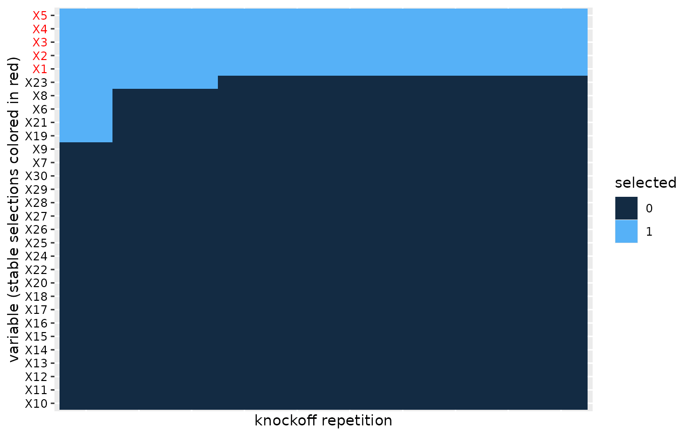 In order to evaluate the robustness of the knockoff selection procedure we can visualize a heatmap of the selections across the knockoff replicates.