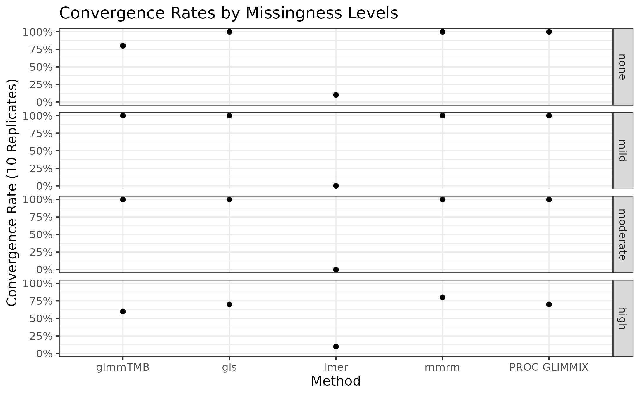The convergence rates of all implementations for stratified by missingness level is presented in the plot below.