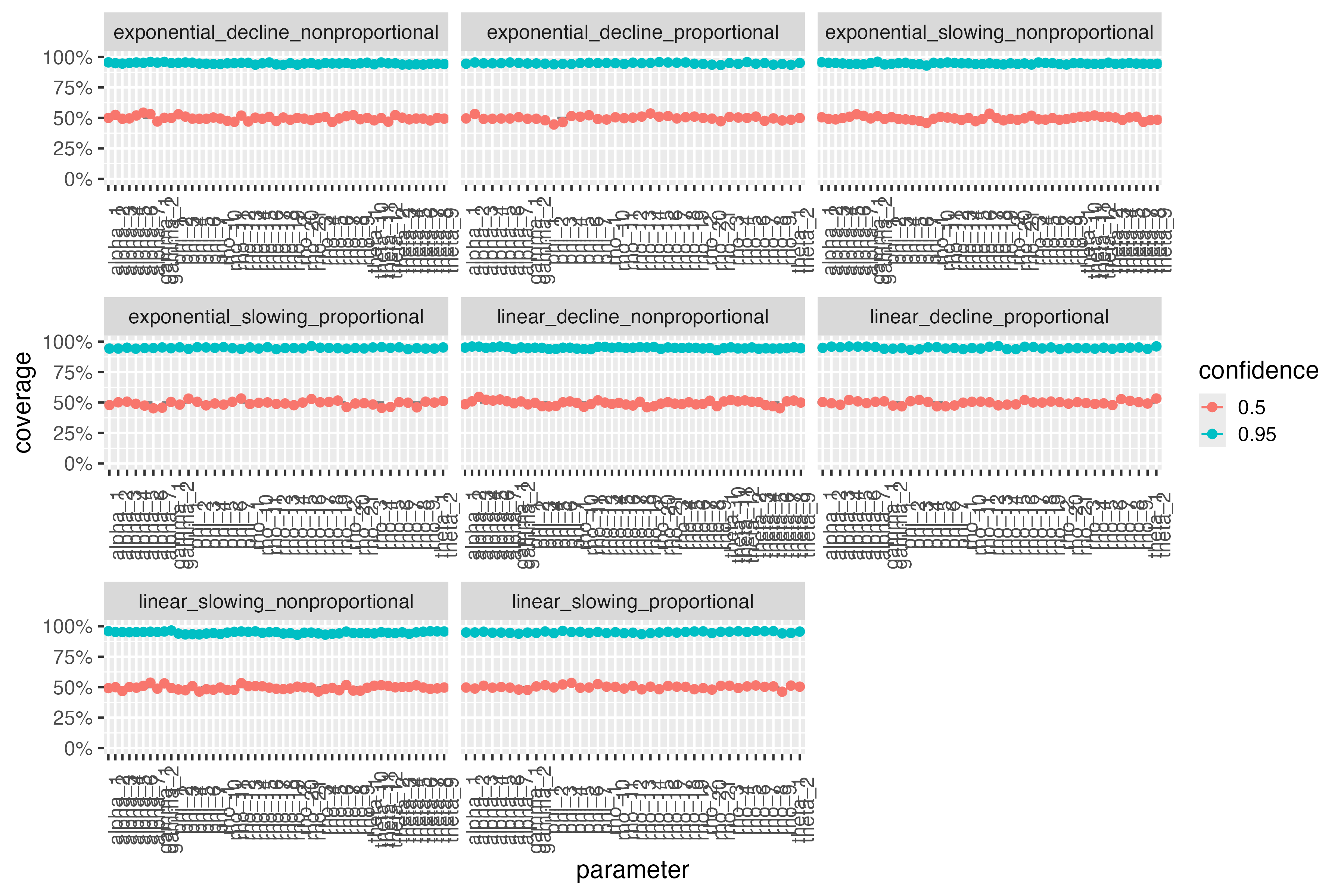 The following plot shows the percentage of confidence intervals that covered the true parameter values. Coverage is shown separately for each parameter in each scenario. For reference, the expected coverage rate is shown as a horizontal solid in each facet.